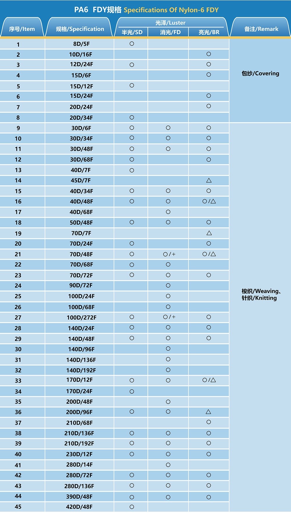 1.Prutex Nylon can produce FDY nylon yarn from 7D-1000D with different specifications and SD, FD, BR with different luster.